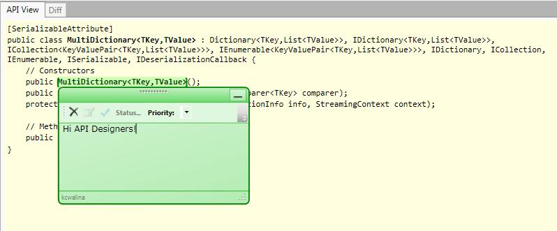API에 의견을 추가하기 위해서는 단지 해당하는 Type이나 관련 맴버들을 선택하시기만 하면 됩니다.선택하시면 아래와 같은 다이얼로그 박스가 뜨게 되고, 박스에 의견을 적으면 Defect DB에 데이터가 쌓이게 됩니다.