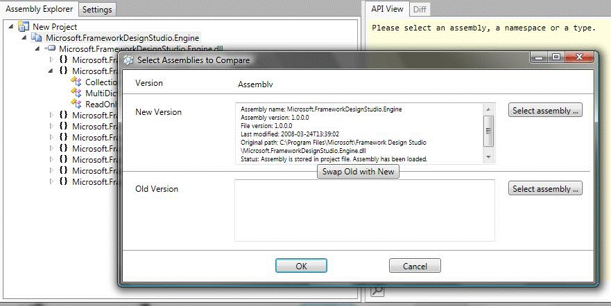 오른쪽 버튼을 눌러 선택한 다음, “Select Assemblies to Compare”라는 메뉴를 선택하신후, “Swap Old with New”를 클릭하십시오. 선택한 오래된 Assembly의 새로운 버젼을 선택한후 OK 버튼을 눌리시면 됩니다.