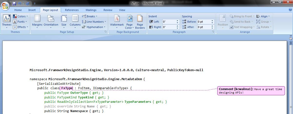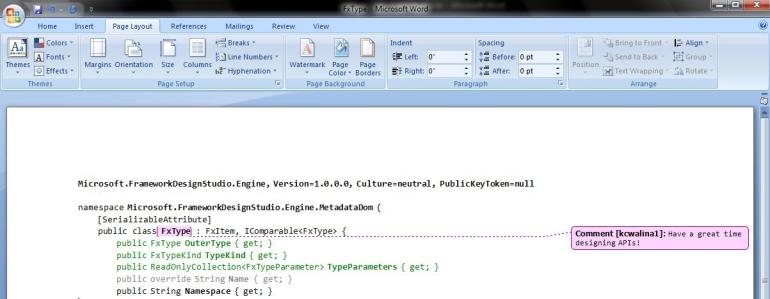 Framework Design Studio에서 적은 검토 (Review) 내용들을 Microsoft Word Comment 형태로 변환하여 아래의 그림과 같이 보여질수 있습니다.