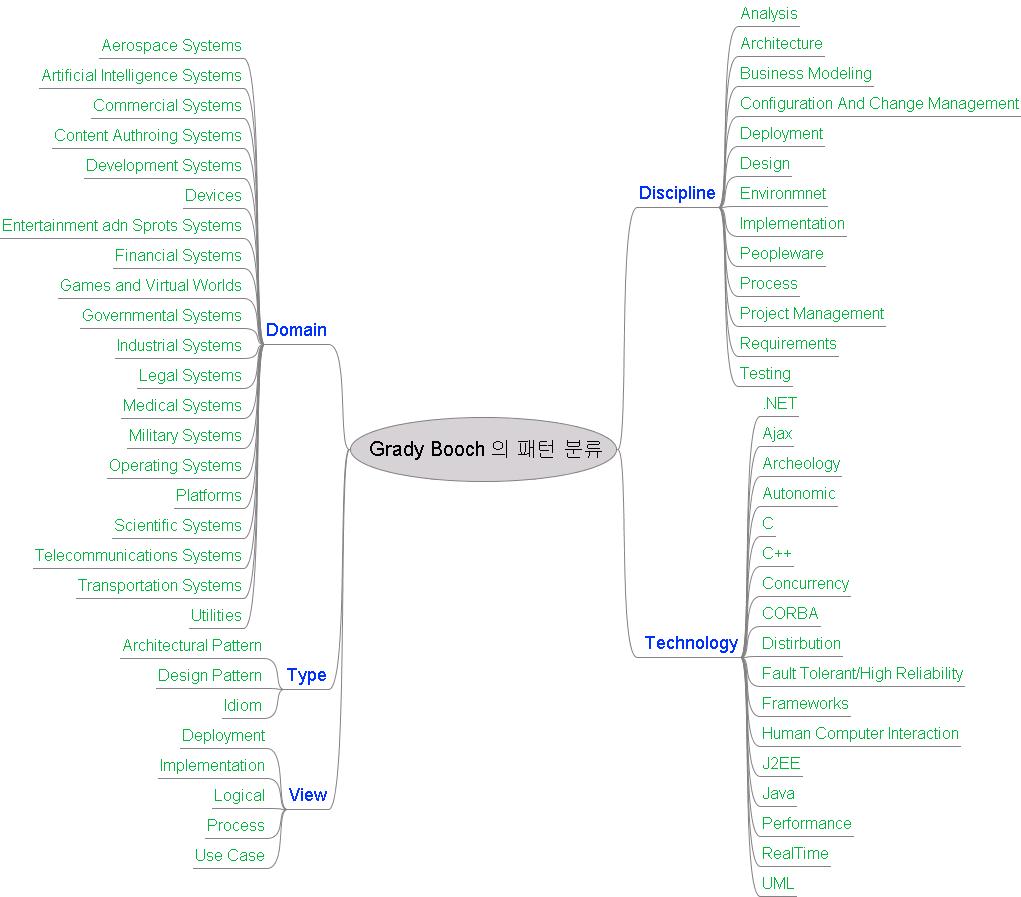 Grady Booch 는 아래와 같이 5개의 다양한 관점으로 패턴들을 바라보고 있습니다.