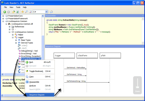 그 다음 Reflector을 열어서 다양한 .NET용 Assembly (3.5, 2.0, Compact Framework 버젼등등.) 파일을 읽어 들이실수 있습니다. 그리고 해당 메소드를 찍어 Sequence Diagram을 찍어보시기 바랍니다.
