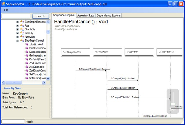 그러던 중 .NET 용으로 툴을 발견했습니다. 바로 SequenceViz라는 툴입니다. 또한 Reflector의 Plug-in도 제공합니다. SequenceViz를 사용하기 위한 환경 구축과 그리고 숨겨진 기능을 공유하고자 합니다. 저 같이 .NET 2.0 버젼을 유지해야 되는 애매한 상황에서는 그럭 저럭 쓸만한 (?) 툴인 것 같습니다.